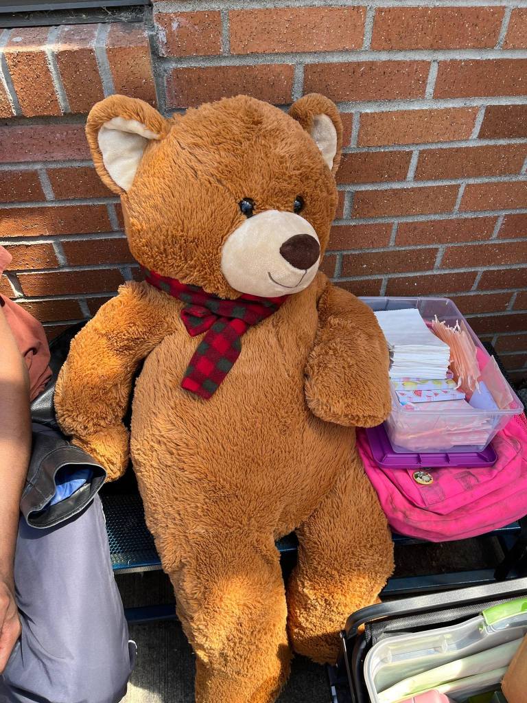 He held up a teddy bear as he walked over towards her. The bear itself was decently large, being on the bigger side of things. Sammy was impressed by it’s weight as well as the stitching. He had a name tag on the back of his neck where someone had written Theofore.