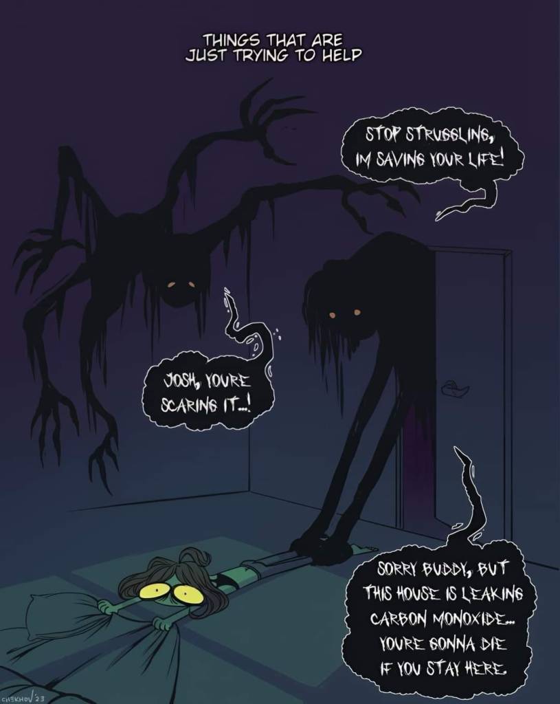 “There is poison leaking through your walls,” the second horror stated as it casually began ushering the first horror back into the wall. “It was hidden there by the ones who came before you. They seek retribution. You will die if you stay here.”